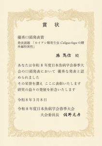 Our student received the ‘Excellent Oral Presentation Award’ at the 2026 Spring Meeting of the Japanese Society of Fish Pathology.