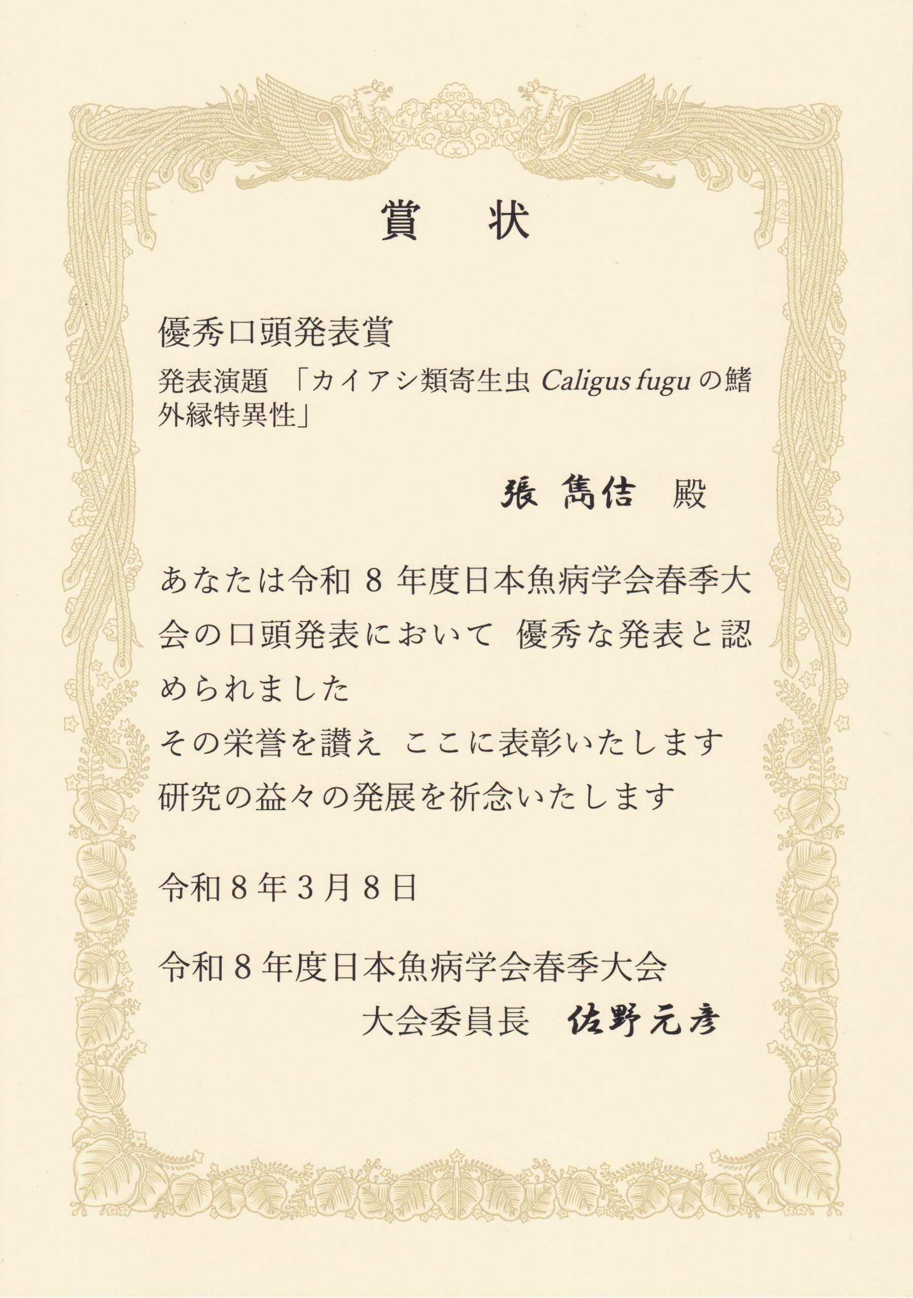 At the 2026 Spring Meeting of the Japanese Society of Fish Pathology held at Tokyo University of Marine Science and Technology from 7 to 8 March, Mr. ZHANG Junji, a first-year student at our graduate school, received the ‘Excellent Oral Presentation Award’.