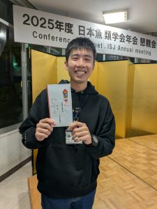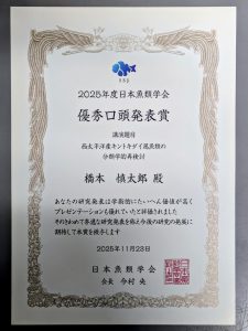 2025年11月21日~24日に東京海洋大学で開催された「2025年度日本魚類学会年会」において、本研究科2年生の橋本慎太郎さんが「優秀口頭発表賞」を受賞しました。 日本魚類学会優秀口頭発表賞は、年会で優秀な研究発表を行った学生会員および外国会員の学生に授けるもので、分類と生態の2分野において各1~2名が選出されます。発表は231件(口頭94件;ポスター137件)で、そのうち学生による発表は120件(50件;70件)でした。