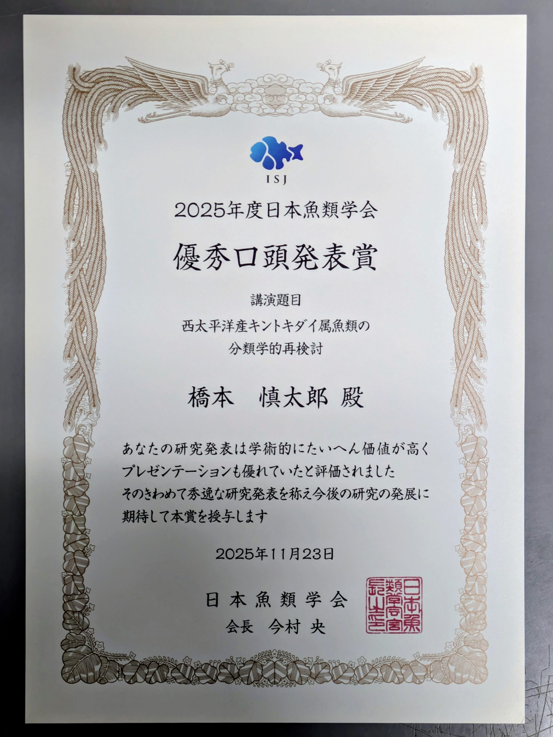 2025年11月21日~24日に東京海洋大学で開催された「2025年度日本魚類学会年会」において、本研究科2年生の橋本慎太郎さんが「優秀口頭発表賞」を受賞しました。 日本魚類学会優秀口頭発表賞は、年会で優秀な研究発表を行った学生会員および外国会員の学生に授けるもので、分類と生態の2分野において各1~2名が選出されます。発表は231件(口頭94件;ポスター137件)で、そのうち学生による発表は120件(50件;70件)でした。