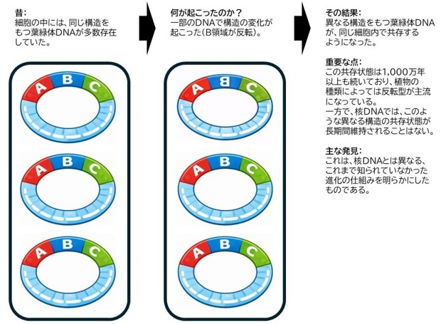 - 本研究により、1つの植物の中に、構造の異なる2種類の葉緑体DNAが共存しうることが明らかになった。