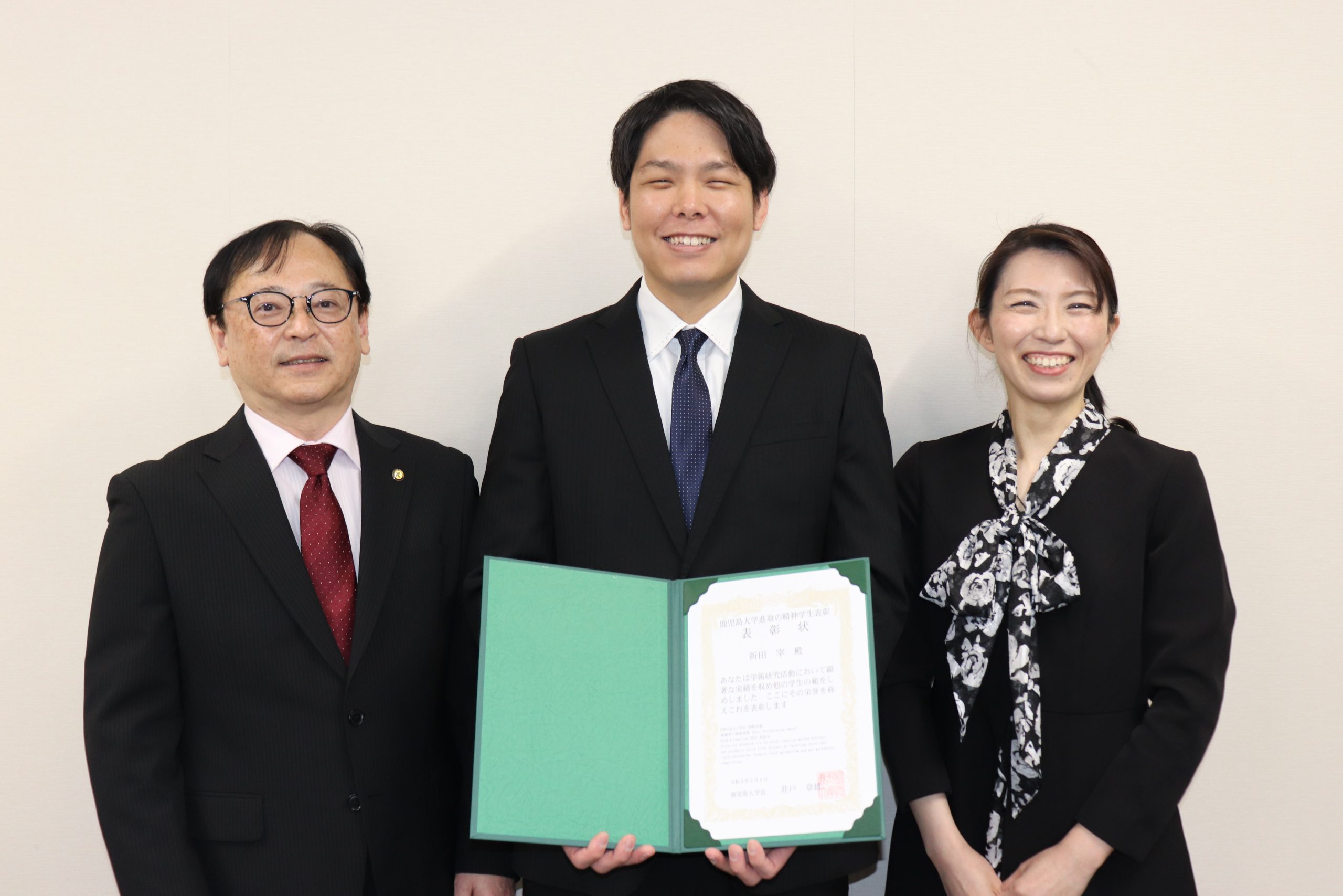 (左から北原研究科長、折田宰さん、坂尾こず枝准教授★折田さんの主指導教員)